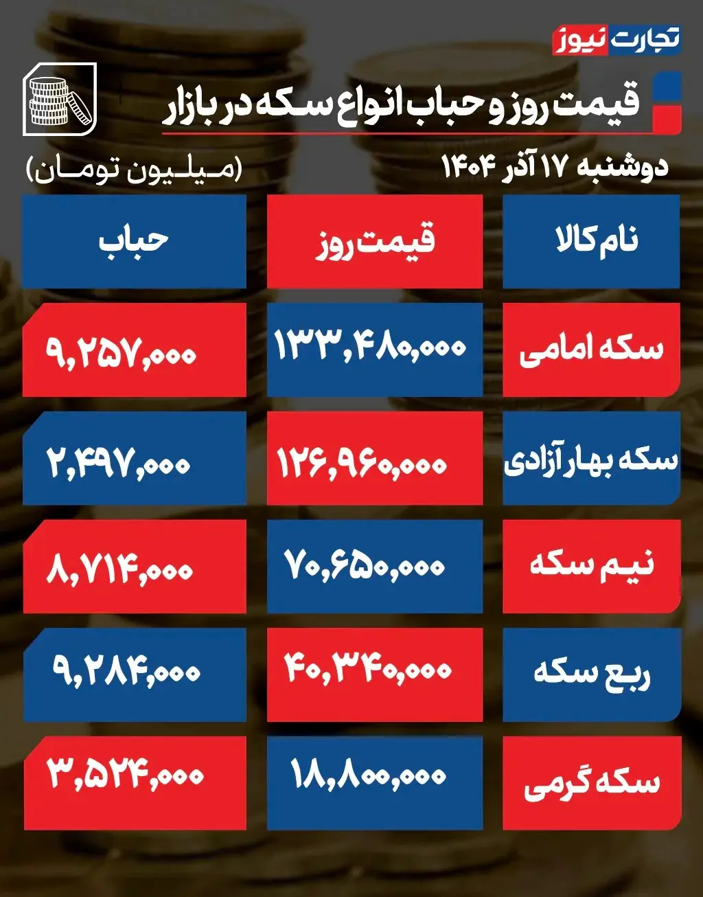 قیمت طلا و سکه روز دوشنبه ۱۷ آذر با حمایت دلار و افزایش ارزش اونس جهانی طلا، در روند صعودی بازگشایی شد. سکههای سنگین میلیونی گران شدند و سکه امامی وارد محدوده ۱۳۳ میلیون تومانی شد. طلا نیز در محدوده قیمتی ۱۲ میلیون و ۷۰۰ هزار تومانی تثبیت شد. کارشناسان اقتصادی در صورت رشد قیمت دلار روند بازار طلا را صعودی پیشبینی میکنند.