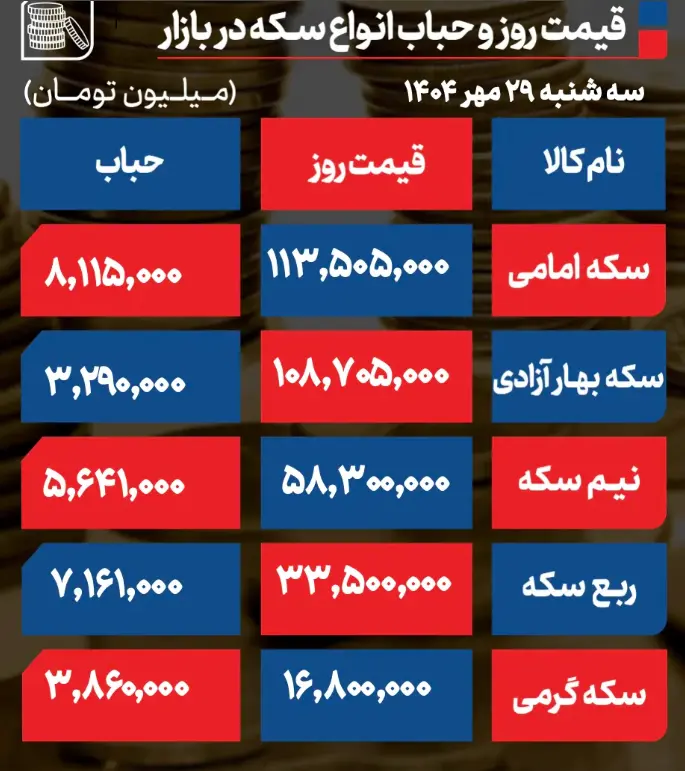 گفتنی است نیمسکه بدون تغییر با قیمت ۵۸ میلیون و ۳۰۰ هزار تومانی معامله شد. قیمت ربع سکه با کاهش ۳۰۰ هزار تومانی با رقم ۳۳ میلیون و ۵۰۰ هزار تومانی بسته شد. سکه گرمی نیز تغییر قیمت نداشت و با رقم ۱۶ میلیون و ۸۰۰ هزار تومانی بسته شد.
