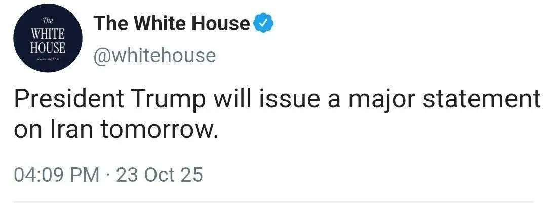 برخی کانالهای تلگرامی با انتشار تصویر توییتی از اکانت کاخ سفید نوشتند: «کاخ سفید: ترامپ فردا بیانیه مهمی درباره ایران صادر خواهد کرد.»