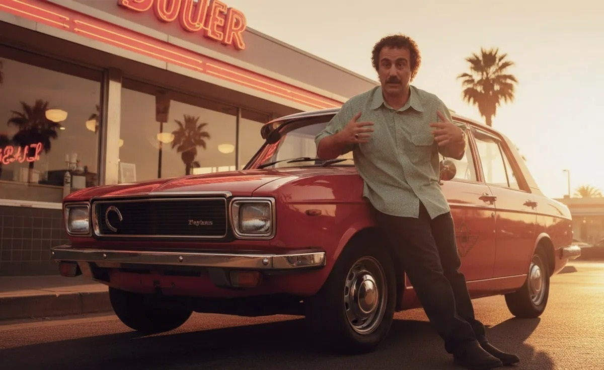 in front of a retro diner یا on a coastal highway at sunset