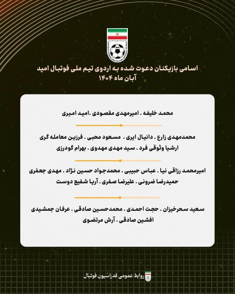 اسامی 23 بازیکن دعوت شده به اردوی تیم فوتبال امید ایران به شرح زیر هستند: