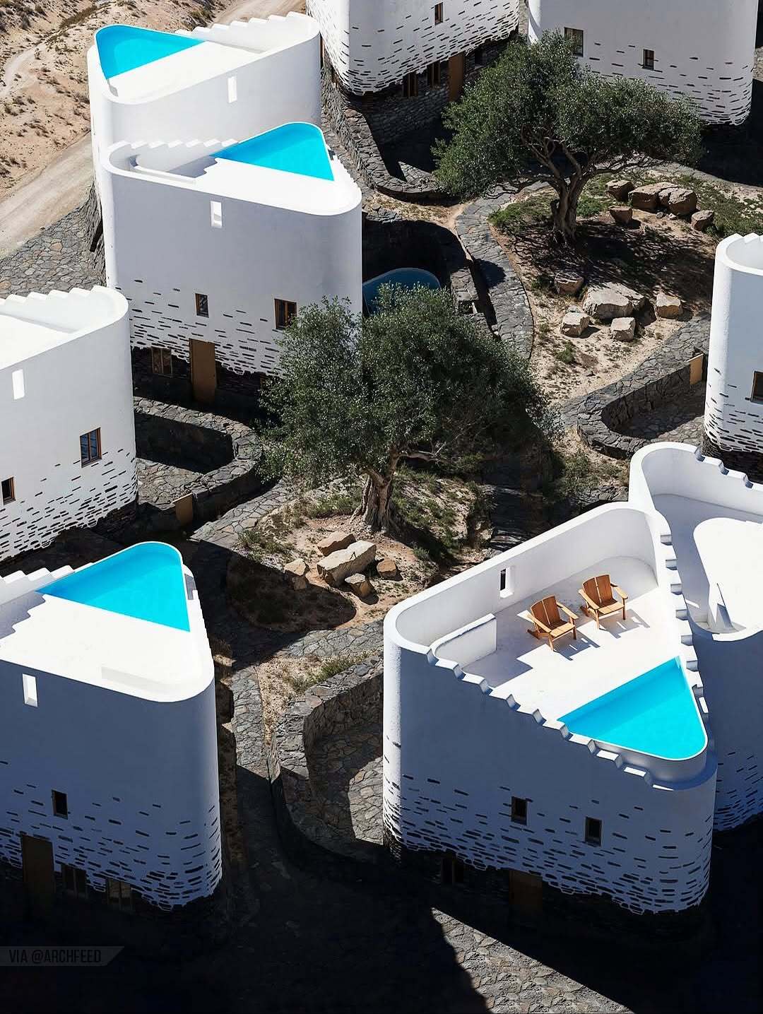 نمایی از طرح مجتمع ۲۹ واحدی ویلایی «بوربولوس» در جزیره سانتورینی یونان (اثر Viiibe Architects)، که با الهام از روش سنتی ساخت دیوارهای حائل سنگی «کسی‌رولیتیا» و تکثیر یک ماژول واحد، به صورت هوشمندانه با توپوگرافی شیب‌دار و آتشفشانی منطقه سازگار شده است.