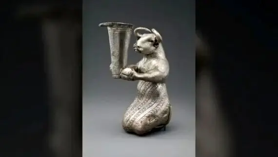 تندیس نقره‌ای گاو زانو زده در حالتی شبیه به انسان که ظرفی لوله دار به دست دارد، پیکره ای شگفت انگیز و رازآلود است که پس از مطالعه و بررسی های مختلف مشخص شد که این اثر ۵ هزارساله در جنوب غربی ایران در جریان یک مراسم دفن شده تا مرز یک معبد را مشخص کند.