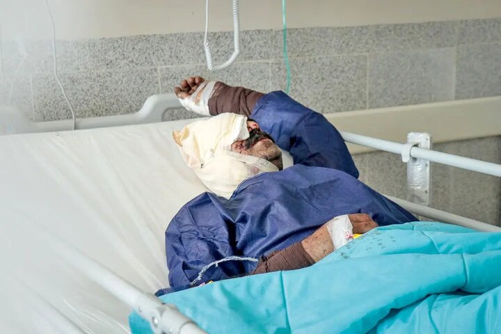 «عصب چشمهاش پاره شده. جفت چشماش. الان بینایی نداره. یه دکتر گفته نابینا میشه، یکی دیگه امروز درمانگاه مطهری گفت، یه امید کمی هست. شیشه و آهنهای کانتینرها وارد چشمش شده. وقتی میخواسته وارد اتاق محل کارش بشه، موج انفجار پرتش کرده و بقیهش رو یادش نیست. فعلاً دکترها در حال بررسیان. اعضای بدنش هم درگیره. چندجا شکستگی داره، مثل ابروش. نمیتونه زیاد صحبت بکنه و خیلی استرس داره که دیگه نتونه ببینه.»