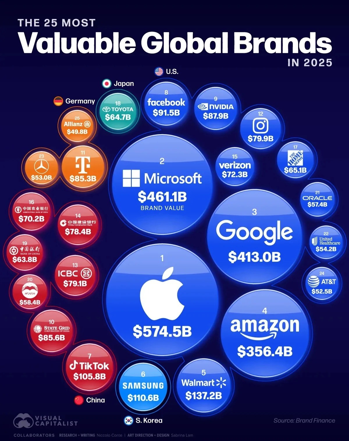 رتبهبندی برندهای جهانی در سال ۲۰۲۵ نشاندهنده تداوم سلطه شرکتهای فناوری آمریکاست. طبق جدیدترین گزارش موسسه Brand Finance، برندهای اپل (Apple)، مایکروسافت (Microsoft)، گوگل (Google) و آمازون (Amazon) به ترتیب چهار جایگاه نخست جهانی را به خود اختصاص دادهاند.