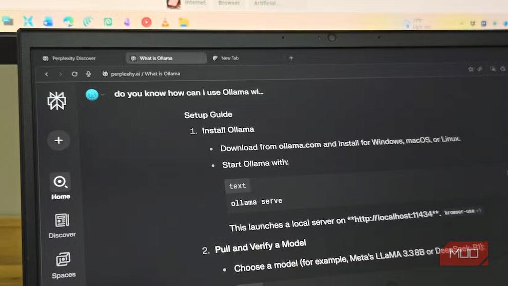 بزرگترین مزیت Comet، دستیار داخلی آن است که با موتور جستوجوی هوش مصنوعی Perplexity یکپارچه شده است. بهعنوان نمونه، وقتی قصد داشتم مدل زبانی محلی Ollama را در BrowserOS نصب کنم، مستندات پیچیده و پراکندهای وجود داشت. اما Comet با ارائه دستورالعملهای دقیق، من را مرحلهبهمرحله از تنظیم متغیرهای محیطی تا اجرای دستورات لازم در ترمینال راهنمایی کرد و سرانجام مدل را بهدرستی نصب کردم.