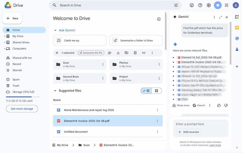جستوجوی فایلهای قدیمی در Drive همیشه نیازمند یادآوری نام دقیق فایل یا مسیر پوشه بوده است. Gemini این روند را دگرگون کرده است. درایو اکنون با کمک Gemini امکان جستوجوی مفهومی را فراهم میکند. کاربر کافی است توضیح دهد به دنبال چه چیزی است؛ برای مثال: «فایل PDF قیمت ترمینالهای بدون لحیم را پیدا کن.» Gemini با تحلیل محتوای اسناد، فهرستی دقیق از فایلهای مرتبط ارائه میدهد، حتی اگر نام فایل یا محل ذخیرهسازی آن از یاد رفته باشد.