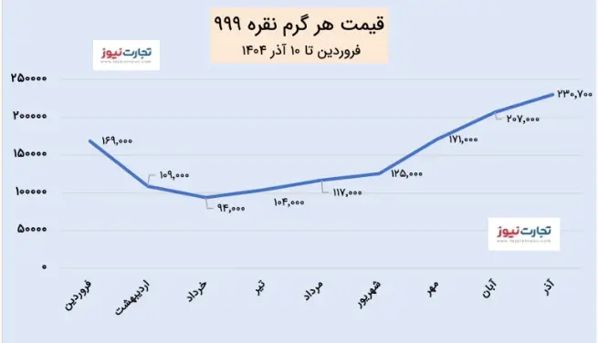 قیمت هر گرم نقره ۹۹۹ ابتدای سال جاری با رقم ۱۶۹ هزار تومان بازگشایی شد و طی دو ماه بعد از آن تا پایان بهار، یعنی اردیبهشت و خرداد ۱۴۰۴، با کاهش ارزش تا رقم ۹۴ هزار تومان پایین آمد.