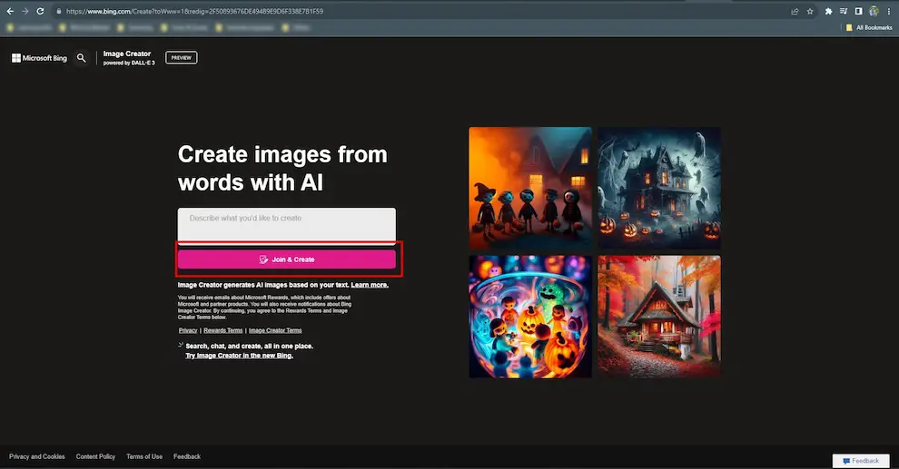 هنگامی که برای اولینبار وارد سایت میشوید، یک صفحه کامل شامل چهار تصویر نمونه ساختهشده توسط هوش مصنوعی و یک کادر ورود متن در بالا نمایش داده میشود. کافیست متن خود را وارد کنید، گزینه Join & Create را بزنید، با حساب مایکروسافت وارد شوید و فرایند ساخت تصویر آغاز میشود.